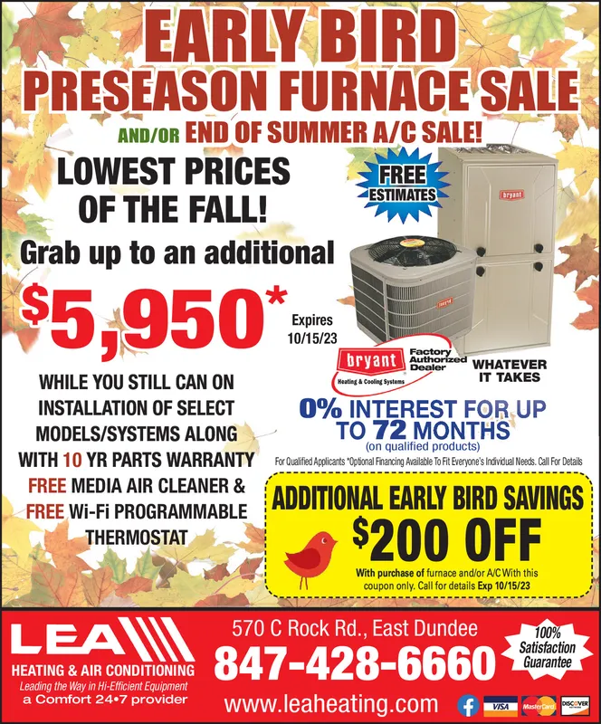 ** EARLY BIRD PRESEASON FURNACE SALE AND/OR END OF SUMMER A/C SALE! LOWEST PRICES OF THE FALL! Grab up to an additional Expires 10/15/23 THERMOSTAT FREE ESTIMATES WHILE YOU STILL CAN ON INSTALLATION OF SELECT 0% INTEREST FOR UP TO 72 MONTHS MODELS/SYSTEMS ALONG (on qualified products) WITH 10 YR PARTS WARRANTY For Qualified Applicants "Optional Financing Available To Fit Everyone's Individual Needs. Call For Details HEATING & AIR CONDITIONING Leading the way in Hi-Efficient Equipment a Comfort 24.7 provider Factory bryant Authorized WHATEVER Dealer Heating & Cooling Systems IT TAKES FREE MEDIA AIR CLEANER & ADDITIONAL EARLY BIRD SAVINGS FREE WI-FI PROGRAMMABLE $200 OFF bryant LEA 570 C Rock Rd., East Dundee 847-428-6660 With purchase of furnace and/or A/C With this coupon only. Call for details Exp 10/15/23 www.leaheating.com f VISA 100% Satisfaction Guarantee MasterCard DISCOVER ** EARLY BIRD PRESEASON FURNACE SALE AND / OR END OF SUMMER A / C SALE ! LOWEST PRICES OF THE FALL ! Grab up to an additional Expires 10/15/23 THERMOSTAT FREE ESTIMATES WHILE YOU STILL CAN ON INSTALLATION OF SELECT 0 % INTEREST FOR UP TO 72 MONTHS MODELS / SYSTEMS ALONG ( on qualified products ) WITH 10 YR PARTS WARRANTY For Qualified Applicants " Optional Financing Available To Fit Everyone's Individual Needs . Call For Details HEATING & AIR CONDITIONING Leading the way in Hi - Efficient Equipment a Comfort 24.7 provider Factory bryant Authorized WHATEVER Dealer Heating & Cooling Systems IT TAKES FREE MEDIA AIR CLEANER & ADDITIONAL EARLY BIRD SAVINGS FREE WI - FI PROGRAMMABLE $ 200 OFF bryant LEA 570 C Rock Rd . , East Dundee 847-428-6660 With purchase of furnace and / or A / C With this coupon only . Call for details Exp 10/15/23 www.leaheating.com f VISA 100 % Satisfaction Guarantee MasterCard DISCOVER